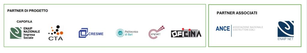 ENAIP Ente Nazionale Acli Istruzione Professionale Impresa Sociale: in qualità di capofila, assume la responsabilità del coordinamento generale e del management strategico del progetto, assicurando il presidio operativo e metodologico di tutte le attività. Oltre a questo ruolo trasversale, ENAIP guida la definizione del nuovo profilo professionale per installatori green e smart, elaborando il relativo