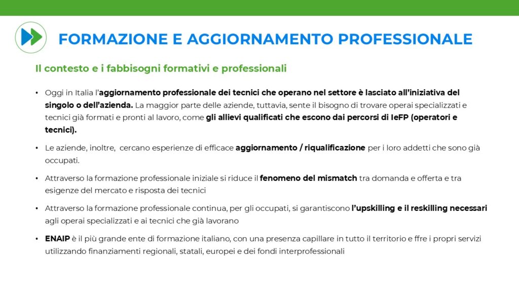 LifeSkema si contraddistingue per progettare, sperimentare e offrire un sistema di formazione professionale, unico in Italia, volta all’uspskilling, all’aggiornamento e al reskilling dei tecnici installatori e degli operatori del settore.