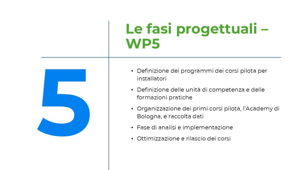 Il contributo innovativo del progetto è elevare il livello di qualifica professionale dei tecnici (attualmente livello EQF 3-4), ritenuto insufficiente a causa di diversi fattori di contesto LINK, al livello EQF 4-5 attraverso l’implementazione di nuovi set di contenuti e di competenze negli ambiti BACS, HVAC e soluzioni integrate di gestione dell’energia.